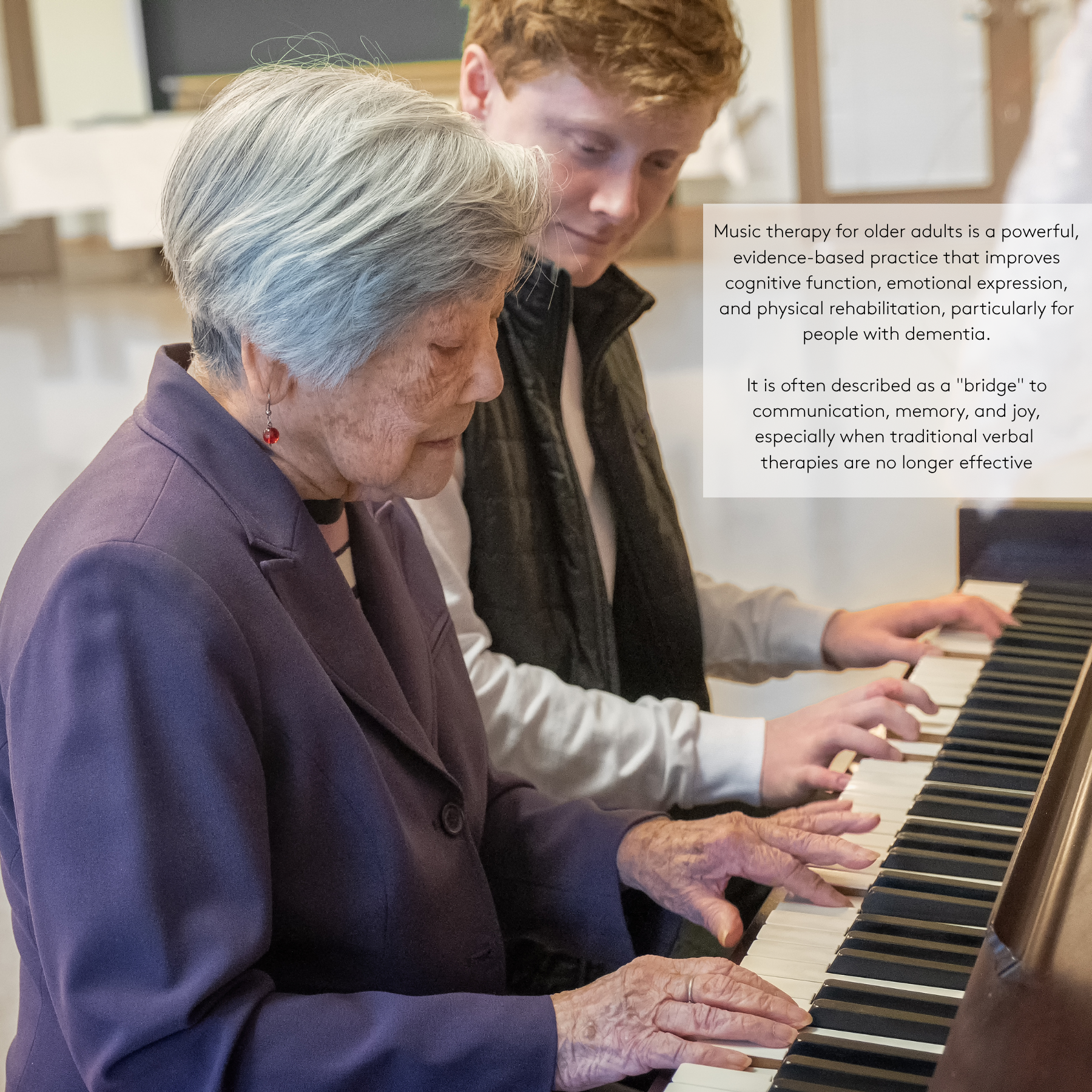Music Therapy is an evidence-based allied health profession that can support a person’s health and quality of life. Music therapy is listed by My Aged Care as an allied health service alongside physiotherapy, occupational therapy, and psychology.
